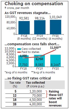 Many reasons are given for GST revenues not being as buoyant as originally envisaged, ranging from the fact that important sectors have been kept outside the GST net to large-scale tax-theft, or even the fact that, as many say, the system was never robust enough to deliver… Whatever the reason, from Rs 92,581 crore in FY18, monthly GST revenues rose to just Rs 101,049 crore in April-September FY20 (see graphic).