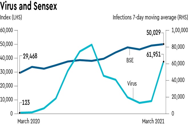 Arguably, the March 2020 level was low on account of the announcement of the lockdown at the national level. But the Sensex recovered and reached the 32,400 level by May, which was when the lockdown was severe, and the migrant issue was at the fore. Once the unlock was announced even as the infection cases rose, the market was impervious to these numbers and marched past 38,000 in August, as the seven-day moving average of infections were as high as 74,000 that month. There was a nervous kind of stagnation in September when cases peaked at above 80,000. Since then, the number of cases came down and the Sensex averaged 50,000 in March as the moving average in the last week came back to a new peak of more than 60,000.