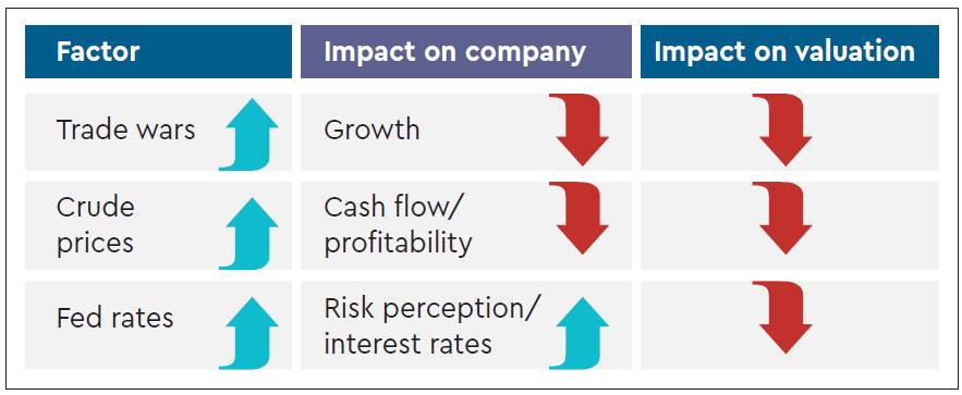 The US and China are breathing fire over trade tariffs. The Federal Reserve (Fed) is giving enough signals for raising interest rates. Crude oil is rising (50% in one year) leading to strengthening of the US dollar and a significant rise in costs for emerging economies. A natural corollary of these developments is that emerging market returns are all over the place. The MSCI Emerging Markets index has witnessed negative dollar returns over the past one year. We try and establish a causal linkage between these developments and the valuations in emerging markets. The underlying principles being that valuations are driven by cash flows, growth prospects and risk perception (read: discount rates).
