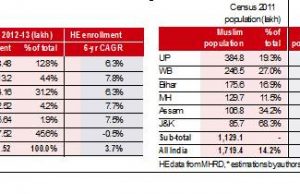 Low GER amongst the Muslim community across India, at 9.7, indicates the need for a different approach. A special drive to increase capacity and number of schools and colleges in Muslim-dominated areas is necessary. Further, focused training toward competitive exams for government jobs and skill development programmes such as National Skill Development Corporation (NSDC) will provide opportunities for educated Muslims to utilise their skills in the workforce. The central government and state governments, where Muslims are in higher numbers, must make it a mission to improve enrollment in the community. Targets to accelerate GER over the next five years must be set and executed. The ministry of minority affairs has sufficient budget of `4,700 crore year-on-year already allocated to implement this. Priority to Muslims’ higher education, especially women, must be executed in this budget.