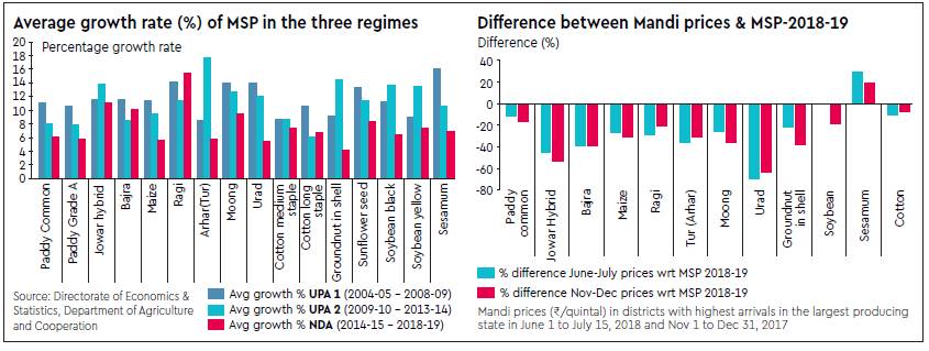 States like Madhya Pradesh and Chhattisgarh just announced ‘political MSPs’ of wheat and paddy with hefty bonuses of Rs 265/qtl for wheat in MP and Rs 300/qtl for paddy in Chhattisgarh for the 2018-19 season as both states are headed for elections! But when professional bodies start recommending what the government of the day wants, bypassing their own ToR, two things happen: first, the credibility of the institution takes a hit pushing it to its eventual burial; and second, the government never gets the right professional advice, and in political cacophony, it can make economic blunders. The case of kharif MSPs is somewhat similar for the reasons explained below. But, let us first see which political regime—UPA-1 or UPA-2 or Modi government—has given the maximum MSP increases. The attached figures show that despite this so called historic decision, the average annual increases in MSPs have been the lowest (except ragi) during Modi government.