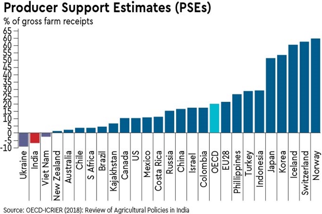 But then, why is there so much opposition? The Congress party is leading the charge. But its own manifesto of 2019 says, “Congress will repeal the Agricultural Produce Market Committee Act and make trade in agricultural produce-including exports and inter-state trade- free from all restrictions”. And further, “We will establish farmers’ markets with adequate infrastructure and support in large villages and small towns to enable the farmer to bring his/her produce and freely market the same” (see points 11 and 12, in Congress Manifesto 2019 under Agriculture section). I fail to understand how this is different from what the three Bills are about? I don’t have any political affiliation, but all my professional life, I spent analysing agri-policies and found how farmers in India have been implicitly taxed through restrictive trade and marketing policies. This is in so much contrast to China and other OECD counties that heavily subsidise their agriculture (see graphic). So, freedom to sell is the beginning of correcting this massive distortion; that is why I welcome this move.