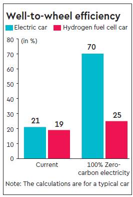 The efficiency during the WTT phase of EVs is low compared to that of HVs because the efficiency of coal power plants is about 30%, and the transmission and distribution losses are above 20%. But, EVs outperform HVs on vehicle performance. EVs lose about 10-15% of their energy in battery and motors while HVs lose 45-50% because of high losses in the conversion of hydrogen to electricity. Overall, the WTW efficiency of a typical electric car in India is about 21% compared to 19% of a similar hydrogen car. As the percentage of electricity produced from coal plants reduces and more and more power is produced from renewable sources, the WTW efficiency of EVs will keep outpacing the HVs.