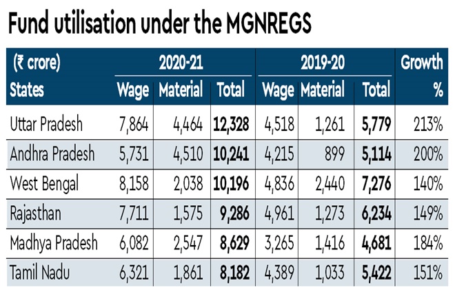These transformative steps taken in UP resulted in the highest increase in the usage of funds available under the MGNREGS in the entire country for both the payment of wages and for the procurement of materials for the creation of durable assets. This led to UP topping all states in fund utilisation under the scheme (see table).