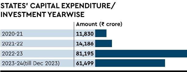 To sustain the momentum of capital investments in the aftermath of the pandemic, the central government took a host of steps to bolster the hands of the states in enhancing their capital investments while maintaining fiscal prudence. But, amongst all initiatives, one of the most sought-after schemes for states was the Scheme for ‘Special Assistance to States for Capital Expenditure’, which came in October 2020. The 50-years interest-free loan proposed under the scheme had multiple parts, with a significant part of the allocation being awarded to states proportionate to their share of central taxes, per the award of the 15th Finance Commission, and other parts linked to either reforms or sector specific areas. This scheme not only helped the states to make significant capital investments into areas that had long-term structural benefits, but also gave them an opportunity to dovetail the state’s capex priorities to the specific components of the scheme and avail benefits.