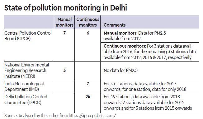 As one can see in the accompanying graphic, continuous monitoring is a recent phenomenon in Delhi. Twenty continuous monitors were installed in 2018, and seven were introduced in 2017. We have data from only four monitors for 2012 onwards. But, there are significant data gaps from these four monitors. For instance, the Dilshad Garden monitoring station had correct data for only 32 days for 2013; the ITO station has data for less than 50% of the time for 2012, 2014, and 2016; and RK Puram has no data for 2013, and 2014. Most researchers have concluded that using data from the continuous monitors to estimate annual pollution levels for the years 2012 to 2016 is statistically wrong. Therefore, one has to rely on manual monitors to establish whether the pollution status has improved or deteriorated since 2012.