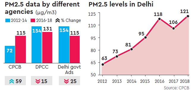 The data from manual monitors, published by CPCB, shows that the amount of PM 2.5 has almost doubled between 2012 and 2018—from 63 µg/m3 in 2012 to 121 µg/m3 in 2018. The average PM 2.5 level during 2012-2014 was 72 µg/m3, and during 2016-18, it was 115 µg/m3—an increase of 59%. So, air pollution levels in Delhi have increased significantly, and not reduced. From where, then, has the Delhi government put together data to show a reduction of 25%? Interestingly, there is another set of data put out by DPCC, which is less publicised. This DPCC data shows that the average level of PM 2.5 was 154 µg/m3 during 2012-14, which reduced to 131 µg/m3 during 2016-2018—a reduction of 15%. DPCC data, however, comes with a disclaimer. It clearly states that for the period 2012-2017, the data is based on four continuous monitors, and the 2018 information is based on 26 monitors. As explained above, the data from the four continuous monitors are incomplete. They cannot be the basis for estimating pollution levels during the 2012-2017 period. Even if we had complete data from the four continuous monitors, comparing data of four monitors with that from 26 monitors is highly spurious. It will not stand even the basic statistical scrutiny.