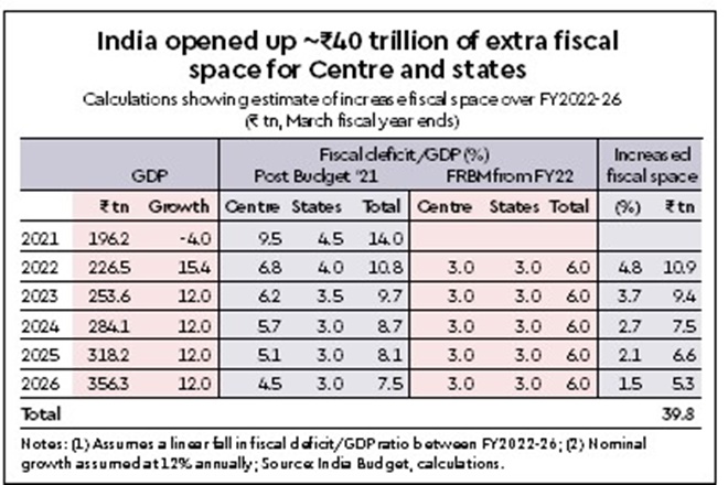 The above trajectories of central and state deficits are then compared to what the earlier Fiscal Responsibility and Budget Management (FRBM) Act mandated: a 3% limit for both Centre and the states. The difference between the erstwhile FRBM mandate and the current expected trajectory gives us an estimate of the increased fiscal space. The accompanying table attempts to quantify the magnitude of the change.