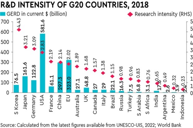 While the absolute expenditures in R&D provide a sense of scale, their percentage to respective GDP provides the research intensity (RI). It is interesting to note that in 2018 for which the latest information is available, South Korea has the highest RI at 4.43%, followed by Japan (3.21%), Germany (3.09%), USA (2.83%), France (2.19%), China (2.14%) and EU (2.02%). India is ranked 17th in the G20, with a RI of 0.65%.