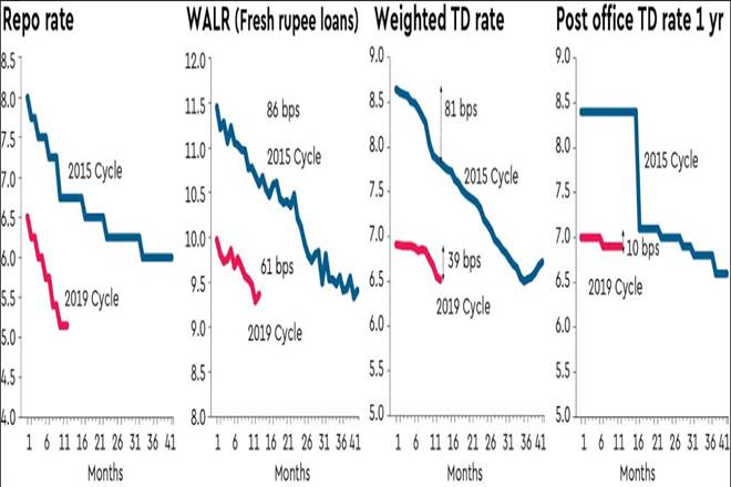 Sticky small savings deposit rates have also been blamed (and, might indeed be a problem for banks to get cheaper TDs), but actually SS rates had remained virtually flat in both cycles at the current stage (The large cuts in SS rates in the 2015 cycle only happened in the 16th month) (see graphic). There might also be the effect of the starting levels of the TD rates in the two cycles, with the higher gap between the 8.64% level and the 4% savings bank rate providing more room for lowering than the 2019 point of 6.9%.