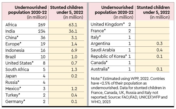 India’s G20 presidency will be remembered as a catalyst in integrating the aspirations of the Global South, particularly Africa, into the mainstream. India’s masterstroke with inclusion of the African Union in G20, acknowledges the significance and potential of Africa as a vital partner in global development and stability. The new G21 will now comprise of 84% of the world’s population, up from about 66% earlier. India and Africa, constituting 36% of the global population, unfortunately are home to nearly 69.4% (503 million) of the world’s undernourished people in 2020-22 (FAO et al. 2023 & WPP, 2022). These two regions together accounted for 67% and 75.8% of world’s stunted and wasted children under five years, respectively, in 2022 (see graphic).