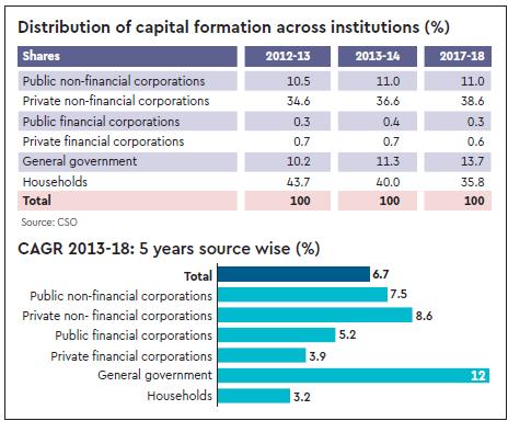 The table also shows the CAGR of GFCF for the period FY13-FY18, i.e. the last five years’ growth according to the source of investment. The overall growth in current terms was 6.7%. The comparable growth in nominal GDP during the same period was 11.4%. Therefore, it was but natural that the GFCF rate had come down from 33.4% in FY13 (which is the base chosen for calculating the five years’ CAGR) to 28.6% in FY18.