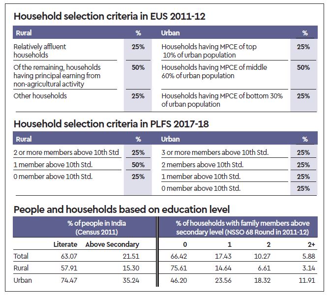 At first glance, the household selection criteria for the PLFS seems aspirational in nature, as the choice of households is dependent upon the education level of the household instead of the earlier criteria of affluence/expenditure. It is true that mostly formal or better-playing employment is linked to the education level of the household members and this move by the PLFS is really aspirational in nature. However, it made me wonder if this selection of sample based on the level of education is really representative of the underlying population of India.