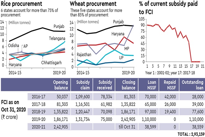 The food subsidy burden has been increasing and has reached levels causing serious concerns to the finance ministry. It has not been able to allocate adequate funds to meet the full requirement of food subsidy. Under-provisioning on this account has been going on, and FCI was being given loans at 8% interest from the National Savings Scheme Fund (NSSF) since 2016-17 to continue its operations. The outstanding loan on this account (October 31, 2020) is Rs 2,93,000 crore.