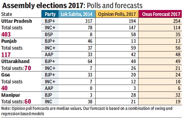 The table shows that we are wide off the mark in UP, according to both conventional wisdom, and the opinion polls. We have been there before, but we do realise that while we can’t get it right like Bihar, we shouldn’t get it wrong like Clinton. There is security in numbers—and forecasts. Hence, the table shows what our models, and method, suggest for the remaining four states going to the polls.