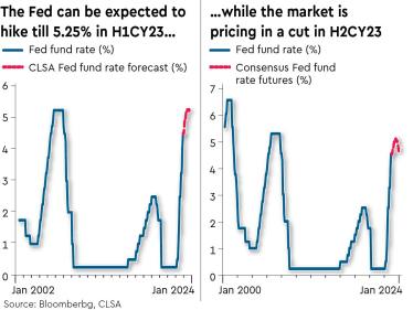 CLSA’s projection 100bps cut in H2FY24 is predicated on the Fed dot plot’s projection of 100bps cuts each in 2024 and 2025. The FY24 growth forecast, at 5.5%, is lower than RBI’s 6.4% and the government’s 6-6.8%. A combined recession can be expected in the US and Europe. CLSA estimates suggest that a US recession shaves off 100 bps of India’s real growth rate. And its FY24 inflation projections, at 5.5%, are aligned with RBI’s 5.3%. Needless to say, a possible El Nino, that drives away rain clouds from India, remains a risk. A 5% change in food prices can impact inflation by over 200bps.