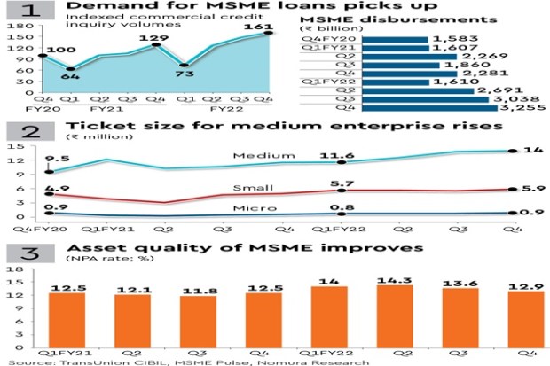 As economic activity recovers, disbursements of MSME loans have risen by 43%, to Rs 3.25 trillion, in Q4FY22 as compared with the same period last year.