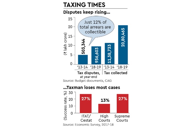 Another interesting statistic that emerges from the CAG reports tabled in Parliament this week is the fact that, while the taxman keeps asking for more taxes – these are then disputed by assessees – the tax department has admitted that just 11-12% of these arrears are collectible! And yet, the taxman has no compunctions in adding to the disputed taxes. Between 2013-14 and 2014-15, while total tax collections rose 1.9 times, disputed arrears rose 1.8 times (see graphic). What makes this worse, as the Economic Survey for 2017-18 pointed out, is that the taxman’s track-record in winning cases is remarkably poor. Till March 31, 2017, in the case of direct taxes, the Survey said, the taxman petitioned the ITAT/Cestat in around 88% of the cases, but it won just 27% of the cases. It fared even worse in the high courts and won just 13% of the cases; the success rate rose to 27% in the Supreme Court.