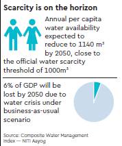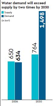 By 2030, India’s water demand will exceed supply by two times, indicating severe water scarcity in the country. In fact, 820 million Indians living in 12 river basins have a per capita water availability close to or lower than 1,000 cubic metres—the official threshold for water scarcity. The average all-India per capita water availability is expected to be 1,341 cubic metres by 2025, and touch a low of 1,140 cubic metres by 2050, close to the official water scarcity threshold.