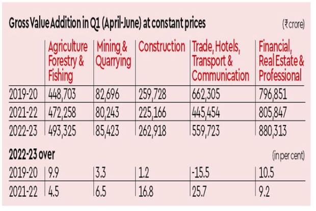 Therefore, the growth that we must look for in 2022-23 is not the growth over 2021-22, but the growth over 2019-20. The last two rows of the Table highlight the difference. While the growth in Q1 of 2022-23 is impressive when compared to Q1 of the previous year (2021-22), it is worrying when compared to Q1 of the bench mark year (2019-20). ‘Agriculture etc.’ seems to have retained its spirit. The pick-up in ‘Financial, Real Estate etc.’ is encouraging. But the other three sectors in the Table tell the story of an economy that is not yet out of the woods.