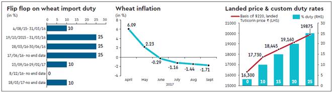 What gives further credence to this speculation is that the government wants to encourage more sowing of wheat by the farmers this rabi season for realising better values next year (marketing year 2018-19). Second, wheat inflation is in the negative zone for the last four months—about -1.71 in September 2017—and thus additional duty will be virtually neutral for macro-inflation. New MSP of wheat has been notified at Rs 17,350/tonne—higher by Rs 1,100/tonne from the previous year. If the government now actually inflates duty by 10%, scaling it to 20%, trade will factor in the MSP, raised by about 7.2%, to elevate local prices also. For importers, a tariff increase of 10% would be substantially offset by the higher MSP and make imports during December 2017-February 2018 viable.