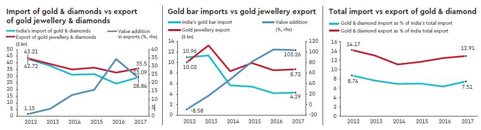 Any policy action to prune down or restrict imports of gold or rough diamonds will have parallel effect in pulling down exports. Indian exports of gold and diamonds are about 13% of national exports in 2017, or about $35 billion (chart 3). Therefore, there is a case for incentivising such imports for more exports. It is a suggestion worth considering by the policy-makers. At a time when Indian exports are sluggish, why not consider linking gold and diamond imports with overall exports. Trade and industry are looking for incentives to export. Conceptually, all exports may be rewarded with a freely tradeable scrip (called the “gold/diamond certificate of import”) of 10% of each Indian export in dollar denomination. With about $300 billion worth of India’s current exports, 10% scrips would be $30 billion. Since gold/diamond imports are worth $30-40 billion, such an entitlement will let earn the exporters market premium of some 5-7%, depending upon the import intensity of gold bars and rough diamonds. The customs duty on gold imports will then have to be made nil within one year of notifying this facility. Such a “gold/diamond certificate” could be issued to the exporter by a bank through which export documents have been negotiated and the payment realised. Those who are not able to import gold/diamonds by using such a scrip, they may pay 20% “penal” duty for clearing their consignment. This duty-free import scrip may be submitted to custom authorities at the time of clearing gold/diamond consignments.