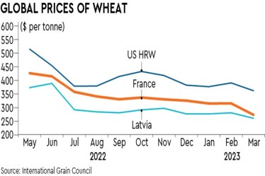 For national food security, Food Corporation of India (FCI) can relax quality specifications for its procurement operations with a view to meet its target of 34 mt. The Centre can also help by giving a bonus of, say, Rs 100-150/quintal to farmers to sell it to the FCI. This would ensure enough buffer with the FCI. If it still finds that the quantity loss is much more than expected, and the procurement is much below the target, it can lower import duty from 40% to, say, 10%, and let imports of wheat flow. Last year (FY23), India exported more than 5 mt of wheat and wheat flour despite bans on wheat exports. Luckily, the global prices have come down sharply over the last one year (see graphic), which makes for a good opportunity for the Centre to build the buffer stock. Wheat price was hovering between $260 (Latvia) and $274 (EU France Grade 1) per tonne in March 2023 (IGC, 2023). Interestingly, the rice stocks with the central pool are more than three times the buffer stock requirement on April 1, 2023. FCI, thus, has the flexibility to substitute wheat with rice in its public distribution system (PM-Garib Kalyan Anna Yojana), wherever feasible, or even go a step further and give the option of direct cash transfers.