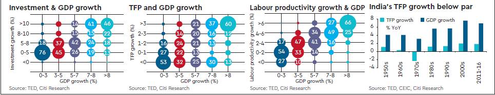 Following this framework, we choose growth in labour productivity, growth in investment, and growth in TFP as the primary drivers of growth in any economy and try to identify threshold levels of these parameters associated with high levels of GDP growth in the past. India’s aspiration is to grow at double digits. For our analysis, we particularly focus on the 8%+ GDP growth club.
