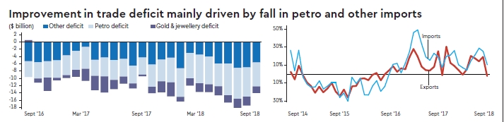 While exports in September contracted 2.2%, this might not be an accurate metric of a business response to the currency, being largely because of the base effect of the sharp spike in export growth in September 2017 that was probably the result of a one-time adjustment to pent up demand, post the frictions generated before and just after the transition to GST. This said, export by value remained at the $28 billion monthly level in September, about the same as the average $27.5 billion during the four previous months. In terms of the composition, the approximately $1 billion rise in petro products and gems and jewellery over August 2018 was offset by a drop in exports of engineering goods and textiles.