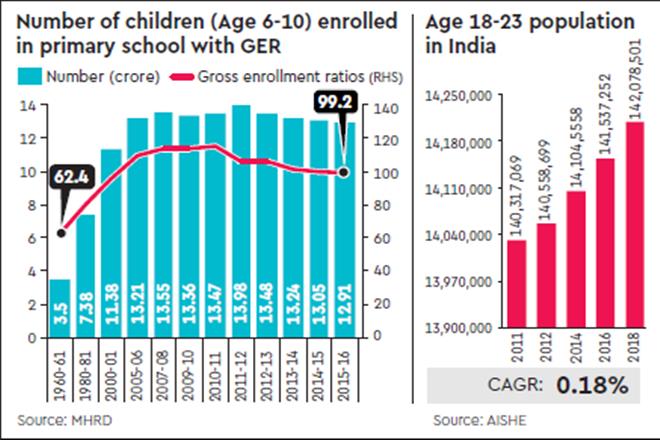 After Class 12, the number of youngsters entering higher education drops further—AISHE data indicates GER in 2018-19 was 26.3 across India. AISHE also uses the information from its surveys to estimate the population in the ages of 18-23, the eligible ages for higher education. The accompanying graphic indicates this number has hardly grown from 14.03 crore in 2011 to 14.2 crore in 2018, translating to a CAGR of only 0.18%. Low CAGR in this age group is a clear indication that our workforce size will stagnate soon.