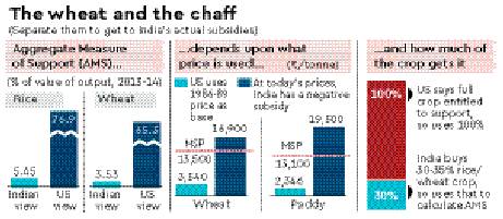 Apart from the price that India guarantees its farmers, what obviously matters is the proportion of the crop that this applies to. Since India’s minimum support price (MSP) is, theoretically a price at which every farmer can sell to the government, the US assumes India’s price support extends to 100% of the crop; India, however, buys only 25-30% of the crop, so, logically, the price support should only apply to that amount. The fact that wheat/rice prices in India are way below MSP in most parts of the country is testimony to the view that MSP is not an effective price support to 100% of the crop. Indeed, while the US calculates India’s AMS for just wheat and rice as Rs 274,515 crore in 2013-14, the entire budget for the ministry of consumer affairs, food and public distribution that oversees all MSP and ration shop functions was Rs 92,927 crore! Just correcting for this distortion will reduce the US estimate of Indian subsidies from the 65-77% range to 16-19%.