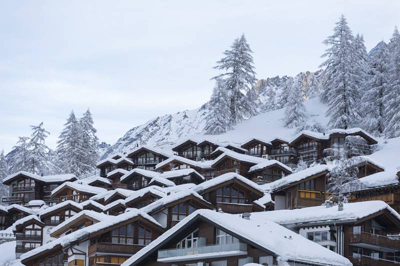 Snow covers the roofs of houses in Zermatt, Switzerland. Due to heavy snowfall and rain showers, Zermatt can only be reached by air. Swiss authorities have closed roads and train service into the town of Zermatt amid a heightened risk of avalanches, stranding some 13,000 tourists in the town. (AP Photo)