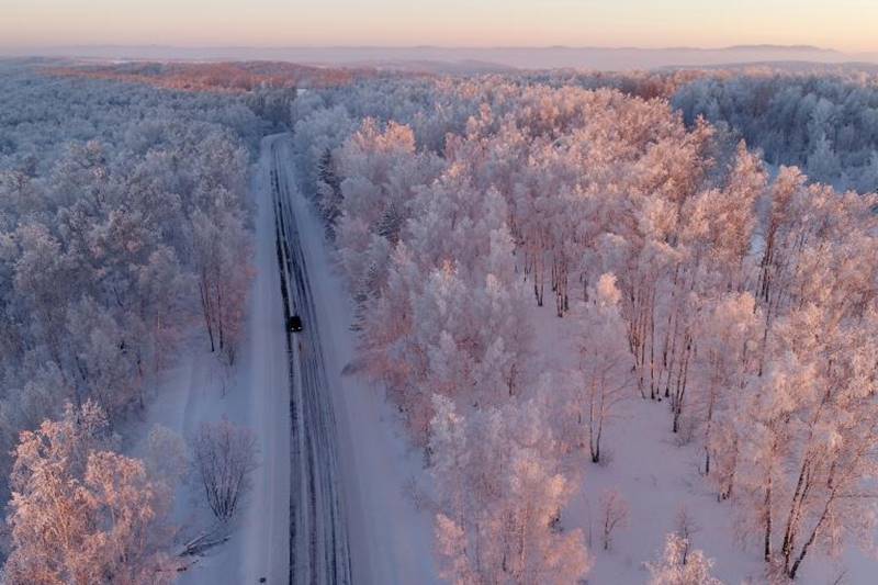An aerial view shows a car driving along a forest road during sunset in the Siberian Taiga area outside the village of Balakhta, in Krasnoyarsk region, Russia. (Image: Reuters) -