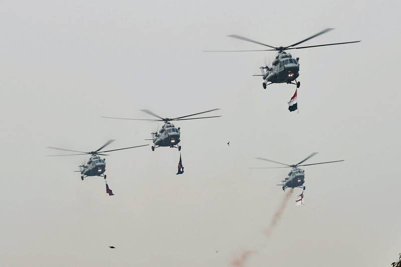 Cultural artists from various states perform at Rajpath during a full-dress rehearsal of the Republic Day parade in New Delhi. (AP Photo) Army tanks and other military equipment roll through Rajpath during a full-dress rehearsal of the Republic Day parade in New Delhi. (AP Photo) Helicopters shower flower petals during full dress rehearsal for the 69th Republic Day Parade at Rajpath. (PTI Photo) The tableau of Akashvani on display during the full dress rehearsal for the Republic Day Parade at Rajpath. (PTI Photo) One of the thematic cultural tableaux rolls through Rajpath during a full-dress rehearsal of the Republic Day parade in New Delhi. (AP Photo)