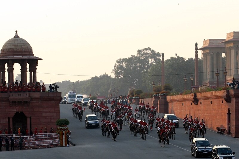 The caravan of the vehicles seen making their way The sun begins to set as the ceremony heads towards its conclusion. A glorious view of the famed Raisina Hill and the Vijay Chowk