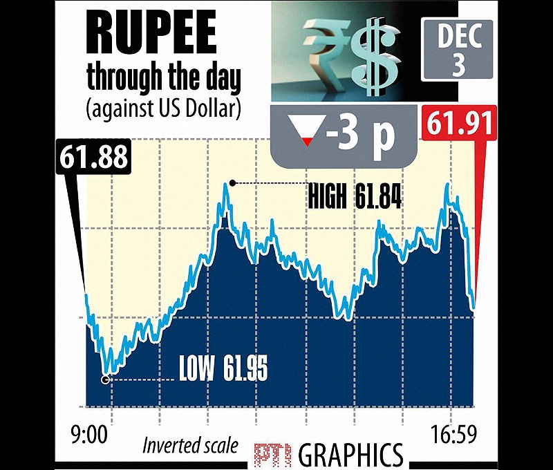 Indian rupee through the day against US dollar. Snapping a two-day upmove, Indian rupee today eased by three paise to end at 61.91 against the Greenback on fresh dollar demand from importers. Graph: PTI -
