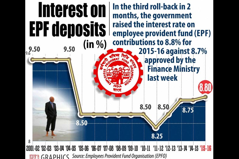 Govt rolls back decision to lower EPF rate; fixes it at 8.8%: Bowing to employee protests for the third time in two months, the government on Friday rolled back its decision of lower interest rate on provident fund deposits to 8.7 per cent for 2015-16 and agreed to fix it at 8.8 per cent as decided by retirement fund body EPFO. (PTI Graphics)
