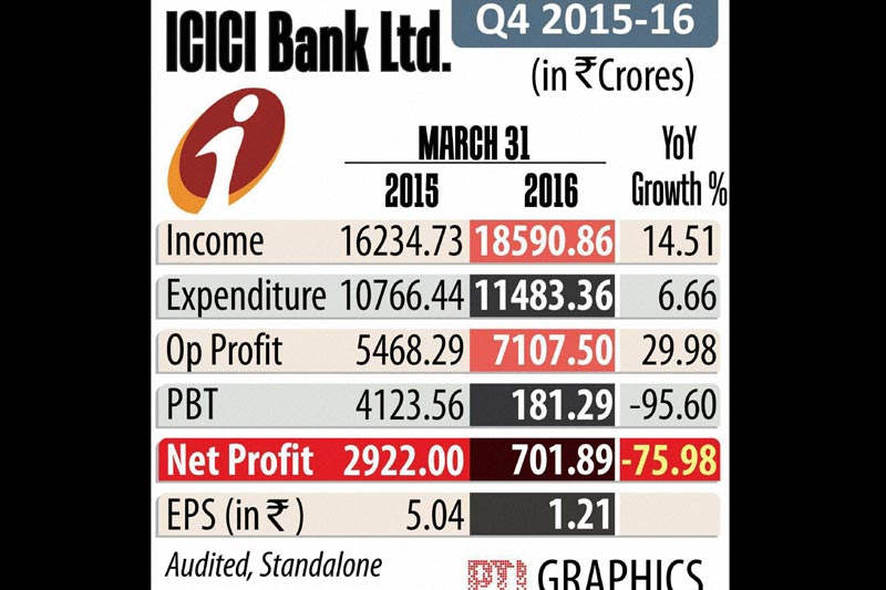 ICICI Bank standalone net plunges 76 pct: The country's largest private sector lender, ICICI Bank, on Friday reported a standalone net profit of Rs 702 crore for the March quarter, a fall of 76% year-on-year (y-o-y), owing to the creation of a collective contingency reserve of Rs 3,600 crore for possible bad loans along with provisions of Rs 3,326 crore. (PTI Graphics)