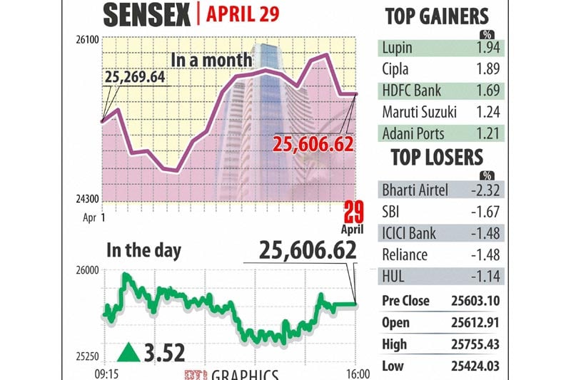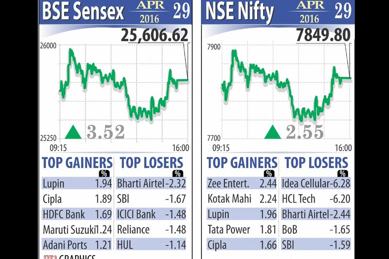 The BSE Sensex and NSE Nifty closed flat on Friday after ICICI Bank Q4 results disappointed markets amid weak global cues. The BSE Sensex closed 3.52 points up at 25,606.62, while NSE Nifty closed 2.55 points up at 7,849.80. (PTI Graphics)