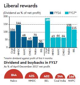 In addition, many PSUs are buying back their own shares, a process that has also added to the government’s kitty. Dividends and buybacks together were as high as 844% of the April-December 2017 net profit of Nalco, while the corresponding figures for NMDC and Bharat Electronics were 425% and 402%, respectively.