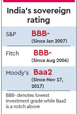 Global rating agency Standard & Poor’s (S&P) will announce the outcome of its sovereign rating review for India on Friday, exactly a week after Moody’s raised its rating for the country by a notch to Baa2 from the lowest investment-grade ranking of Baa3. While the Moody’s upgrade came after a long gap of 14 years, S&P had last upgraded India’s rating from junk grade “BB+” to lowest investment grade “BBB-” on January 30, 2007, and has since retained it at that level, citing the country’s low GDP per capita and weak public finances. S&P had said in November last year that India’s sound external position and inclusive policymaking tradition balanced against the vulnerabilities stemming from its low per capita income ($1,700) and weak public finances. “The outlook indicates that we do not expect to change our rating on India this year or next, based on our current set of forecasts,” it had said, while reaffirming the extant rating.