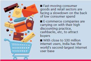 Even as FMCG (fast-moving consumer goods) and retail sectors are facing a slowdown on the back of low consumer spend, e-commerce companies are carrying on with their high discounting practice, cashbacks, etc, to attract buyers.