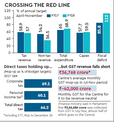 The Centre’s fiscal deficit breached the budgeted level to touch 112% of the full-year target in just eight months, reinforcing concerns about a slippage in 2017-18 unless revenue mop-up goes up substantially and/or the government reins in spending in the last quarter. The deficit in the corresponding period of last year was 85.8%. A front-loading of expenditure following the Budget date advancement this year made the deficit figures up to November appear worse. A massive plunge in non-tax revenue and lower-than-expected goods and services tax (GST) collection caused a revenue shortfall, while both revenue expenditure and the more-productive capital spending inched up, driving up fiscal deficit to Rs 6.12 lakh crore against the full-year estimate of almost Rs 5.47 lakh crore, showed official data released on Friday. On Wednesday, the government had announced plans to borrow an extra Rs 50,000 crore through dated securities this fiscal. However, with direct tax collection still keeping with the desired trend, an increase in tax mop-up, PSU dividends and disinvestment receipts in the remaining months of the fiscal would be key to preventing a flare-up of the fiscal deficit, which was targeted at 3.2% of GDP in FY18. Already, at around Rs 36,768 crore, the Centre’s average monthly GST collection between July and November has been around Rs 6,000 crore lower than the desired level to achieve revenue neutrality. Since direct tax collections usually go up in the last quarter of a fiscal, the government may hope to see a repeat of the trend this year as well. However, in the case of GST, only eight months’ collections will be accounted for in the current year, though by March-end the new tax will have existed for nine months. Revenue deficit touched 152% of the Budget estimate for the full year during April-November. At 33% of the budgeted target up to November, the receipt of dividends and profits (a major part of non-tax revenue) trailed last year’s level of 70%. The subsidies payout, however, remained at 86% of the full-year target, a tad higher than a year before.
