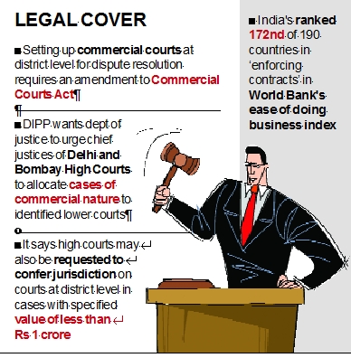 With India staring at yet another year of poor performance in “enforcing contracts” in the World Bank’s ease of doing business index, the department of industrial policy and promotion (DIPP) has asked the ministry of law and justice to help expedite the process of setting up commercial courts at the district level for swift dispute resolutions.