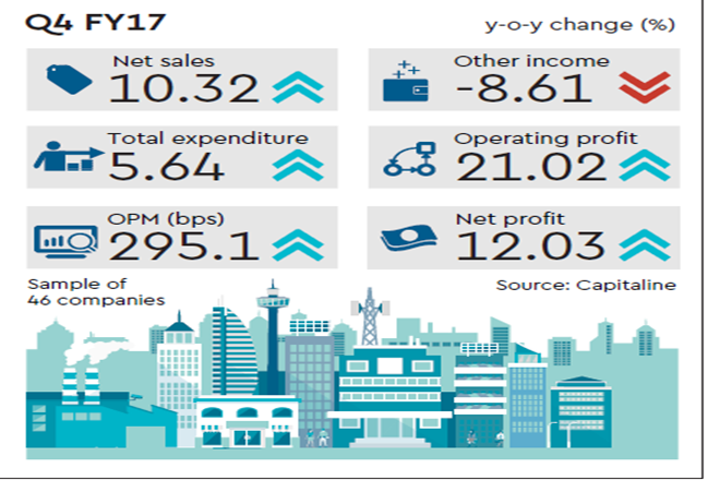 Again, profits were bumped up by lower costs and other income. In some instances, costs have risen denting profit margins. At ACC, for instance, revenues rose a good 8% y-o-y with volumes up nearly 4% y-o-y. However, operating margins contracted by over 190 bps due to higher power, fuel and freight and forwarding expenses. The consumer staples space is yet to recover from the impact of demonetisation. Despite spending large sums on promotions and investments in sales infrastructure, business was dull at Bajaj Corp. Although realisations were better thanks to a better mix of products and stable raw material prices helped push up gross margins by nearly 300 basis points y-o-y, poor volumes — down 7% — resulted in ebitda margins contracting 380 basis points y-o-y.