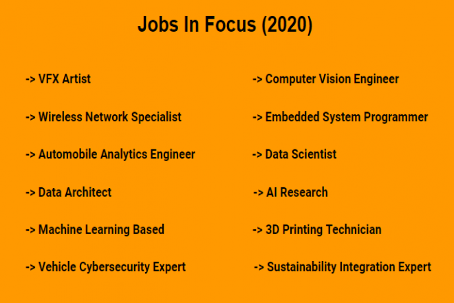 By 2020, 60-65 per cent of the workforce in the IT sector and 50-55 per cent in the automotive sector would work with radically different skill sets. Future job opportunities will be higher in these roles: VFX Artist, Computer Vision Engineer, Wireless Network Specialist, Embedded System Programmer, Data Scientist, Data Architect, AI Research Scientist, Automobile Analytics Engineer, 3D Printing Technician, Vehicle Cybersecurity Expert, Sustainability Integration Expert etc.
