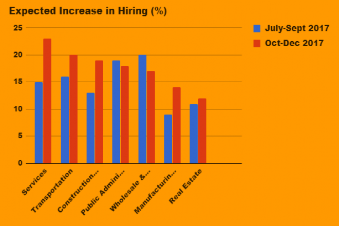 In India, the services sector is going to be the biggest job market and will increase its hiring by 23 per cent in Oct-Dec 2017. In the previous quarter, it had only 15 per cent increase. The services sector will be followed by the transportation and utilities sector.