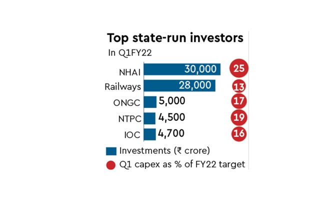 In Q1FY22, the railways was the second largest investor by deploying capex of about Rs 28,000 crore or 13% of its annual target of Rs 2.15 lakh crore. Railways’ investment is largely in the laying of new lines, doubling of tracks, augmenting traffic facilities and construction of rail over bridges/road under bridges.