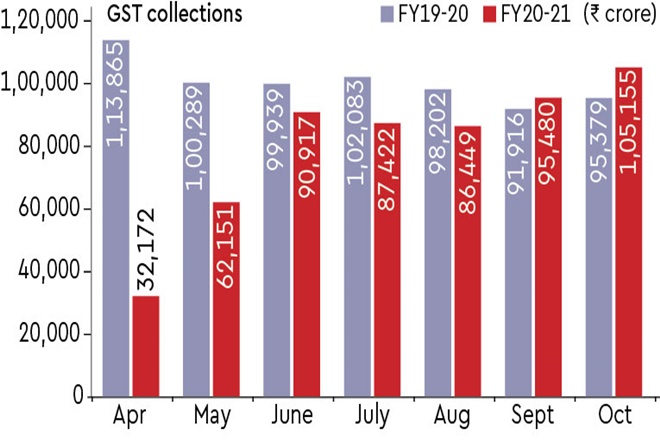 The gross goods and services tax (GST) revenue for October came in at Rs 1,05,155 crore, the highest level since February and up a solid 10% over the mop-up in the year-ago month.
