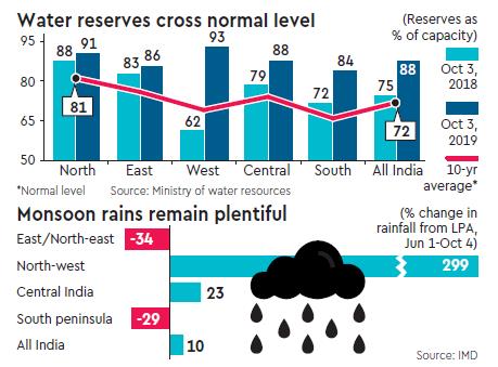 In an unusual scenario, water reserves across northern, eastern, western, central and southern regions this year have exceeded the level witnessed at the same time last year as well as the normal 10-year average (See the chart). This will help boost the Rabi crop sowing, which will start in the coming weeks, on time. Of course, other aspects like temperature in winter (especially for crops like wheat) will also play a vital role in farm production. The government, which is battling a slowdown in manufacturing as well as key services, is desperately hoping for a recovery in the agriculture sector to prop up the overall GDP growth.